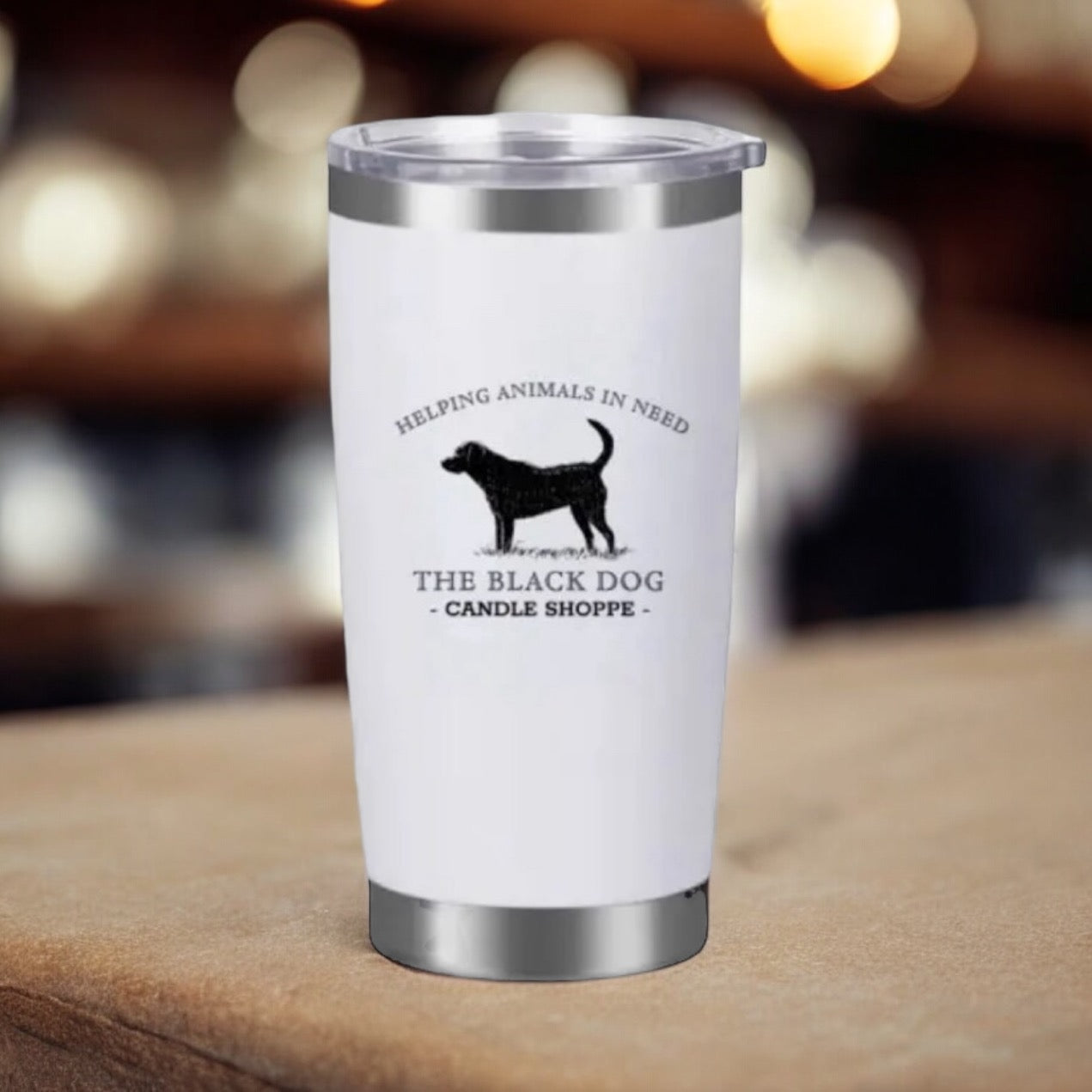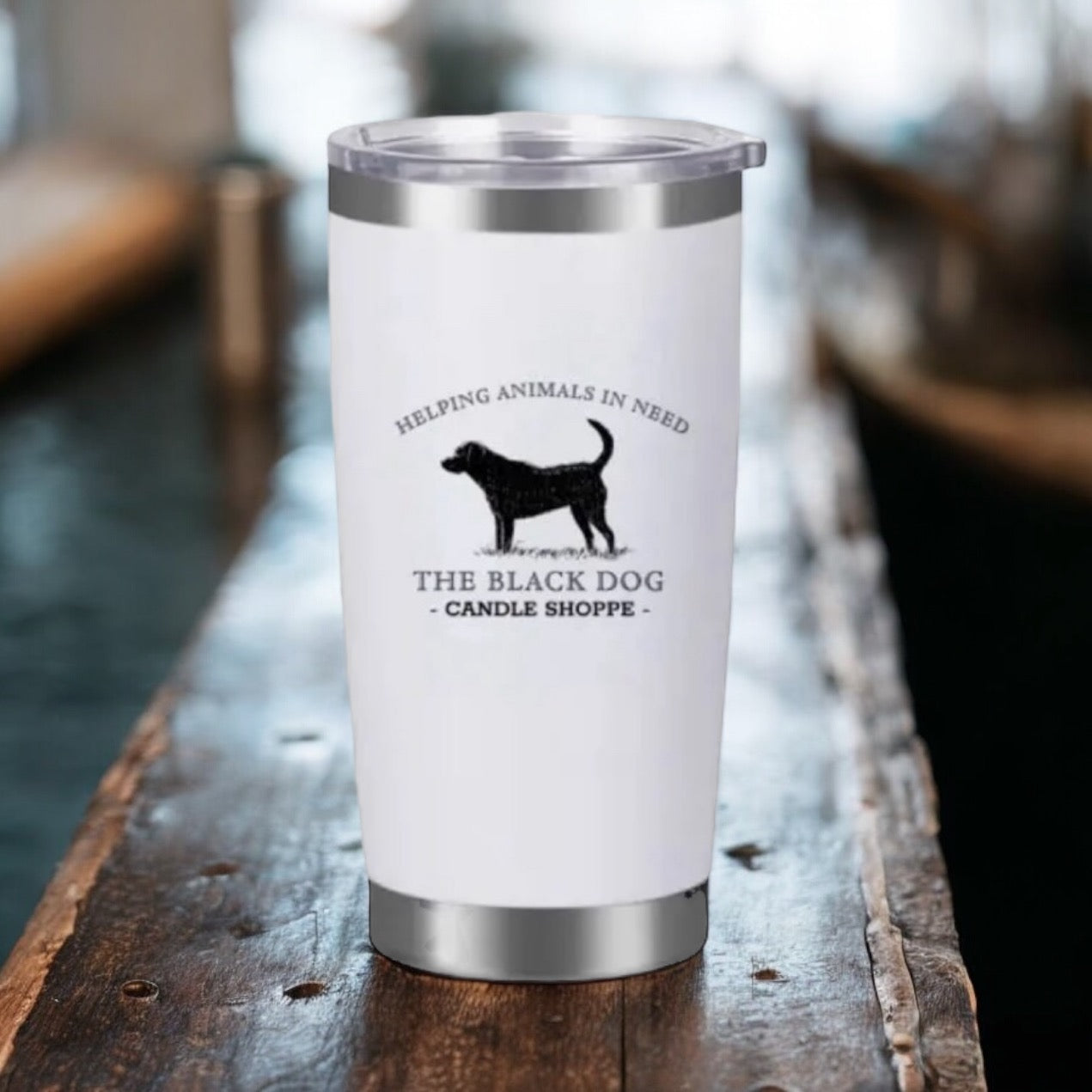 Start your day with style and convenience with this sleek 20oz stainless steel coffee-to-go mug. Featuring a crisp white exterior, this durable, double-walled tumbler keeps your beverages hot or cold for hours, making it the perfect companion for your busy mornings, long commutes, or cozy weekends. The classic Black Dog Candle Shoppe logo is subtly featured on the front, giving a nod to your favorite candle shop while offering a touch of sophistication.