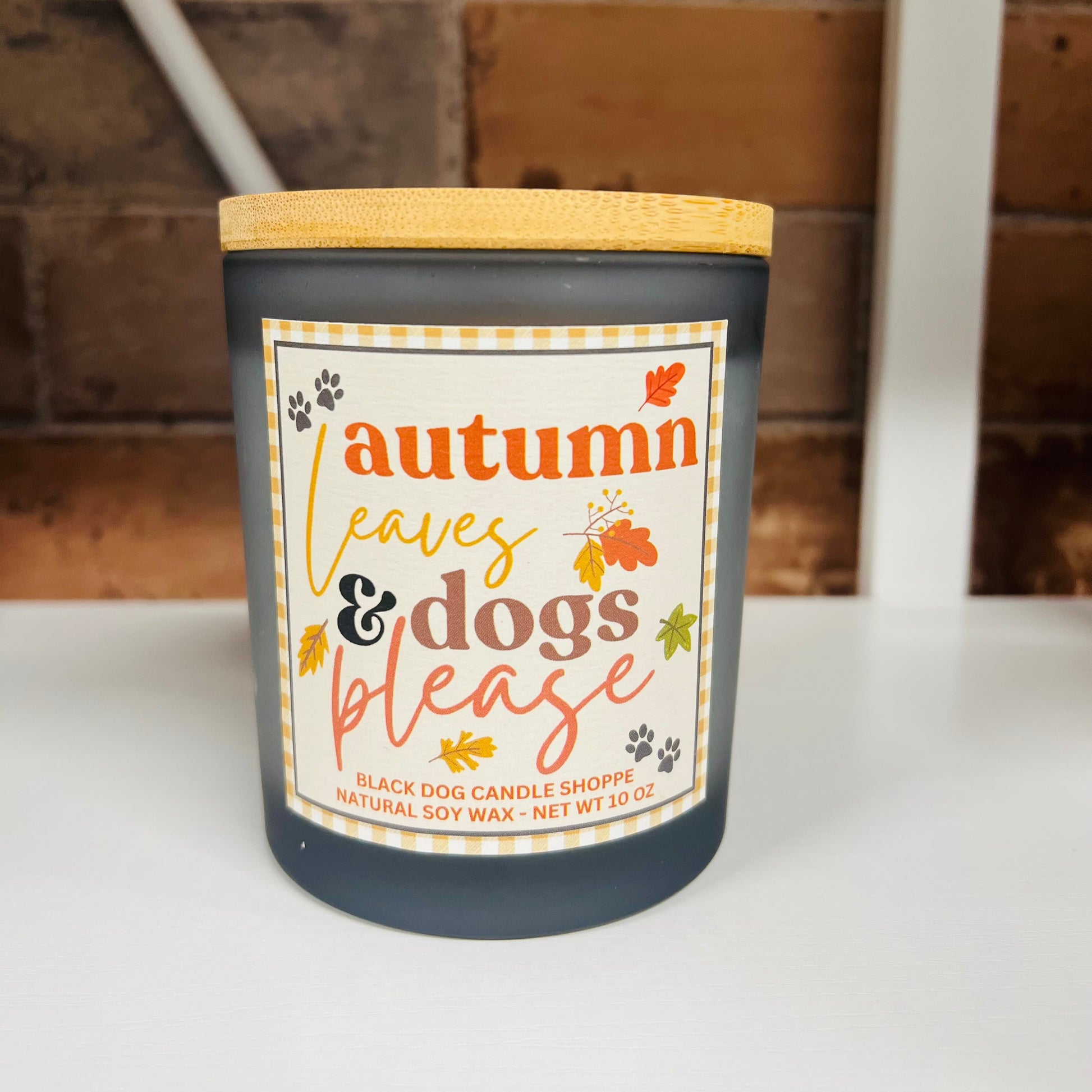 Celebrate the coziest season with our "Autumn Leaves & Dogs Please" candle — a fall favorite for dog lovers everywhere. Hand-poured in a frosted black glass vessel and topped with a natural bamboo lid, this 10 oz soy candle adds warmth, charm, and a little paw-some personality to your space.