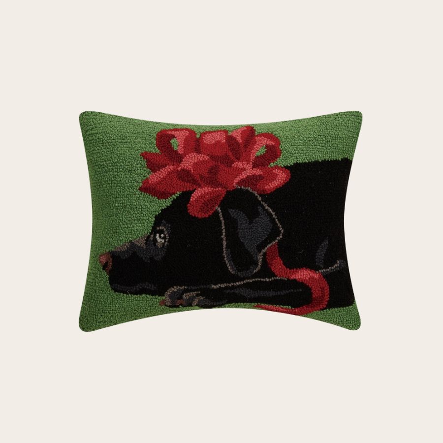 Add a touch of festive charm to your space with this cozy hook pillow featuring an adorable black dog wrapped in a red ribbon and topped with a big holiday bow. Set against a cheerful green background, this playful design brings warmth and whimsy to your holiday décor — or makes the perfect gift for the dog lover in your life.