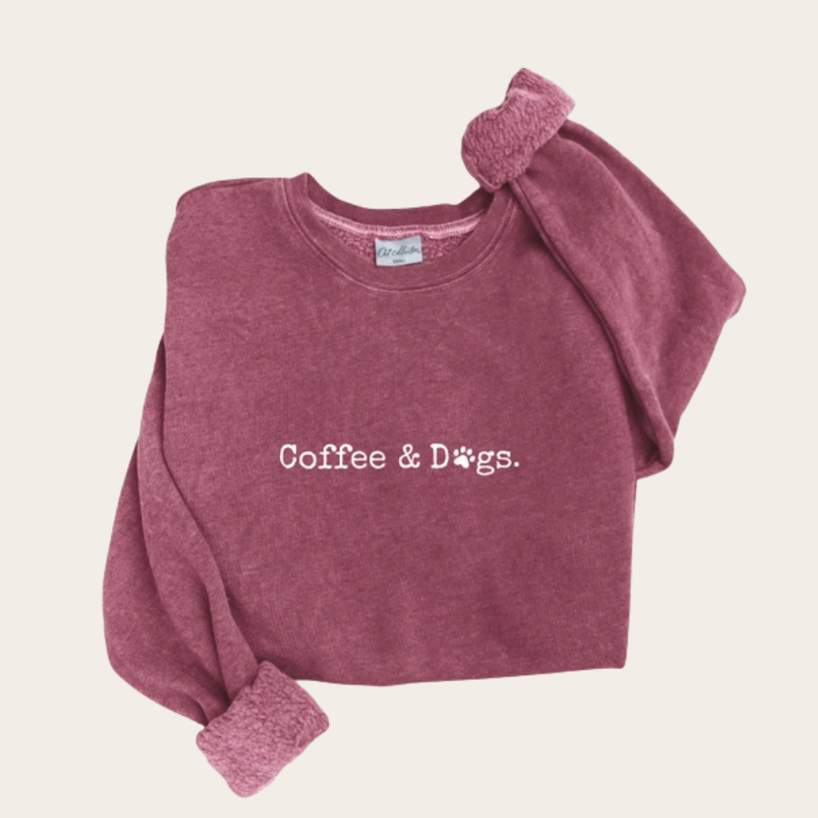 COFFEE AND DOGS Mineral Washed Graphic Sweatshirt Unisex Fleece Pullover Relaxed Fit.