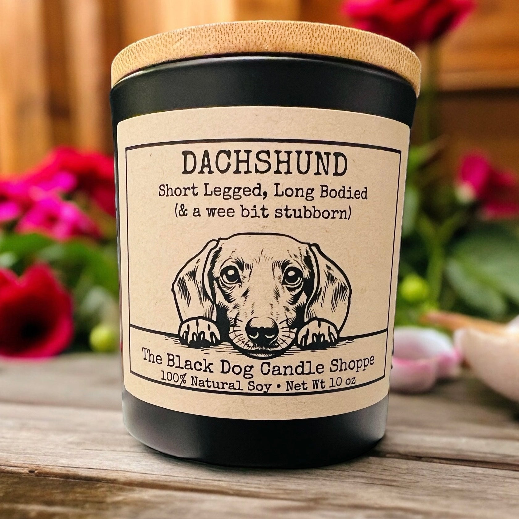 Sleek, loyal, and full of charm — just like the beloved dachshund. This hand-poured soy candle comes in a sophisticated frosted black vessel, a nod to the breed’s bold personality and elegant silhouette. Whether you're a proud dachshund parent or simply a fan of their long-bodied cuteness, this candle brings a touch of warmth and whimsy to any space.