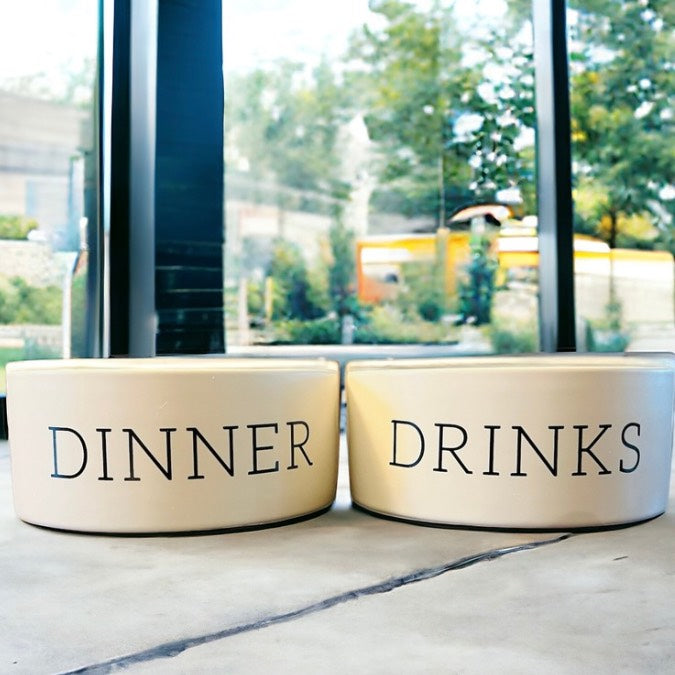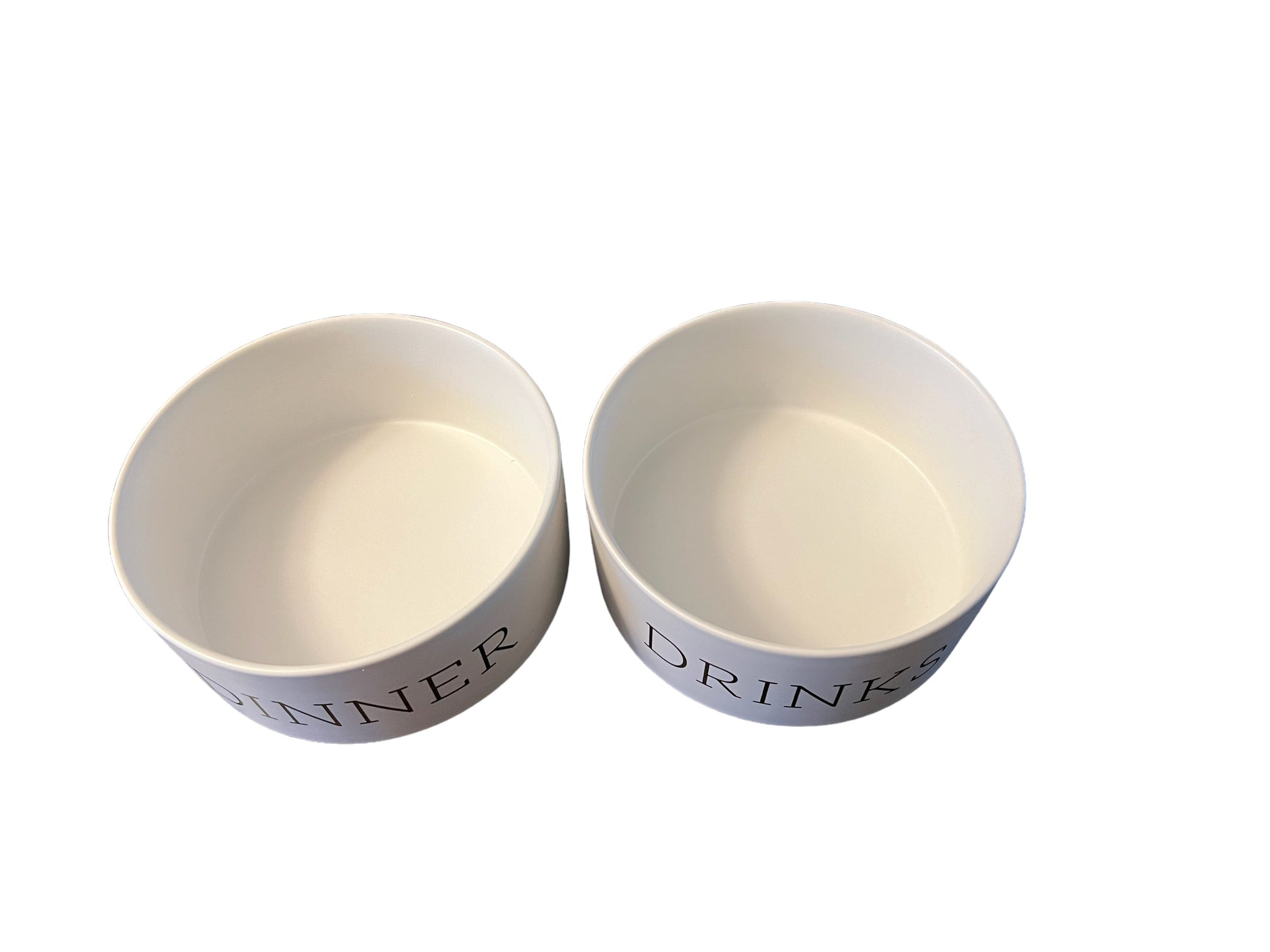 These adorable dog bowls are made of ceramic. They are dishwasher safe. They are sold as a set. Each bowl is 6” in diameter and 3” high. Recommended for small dogs (more sizes will be added)