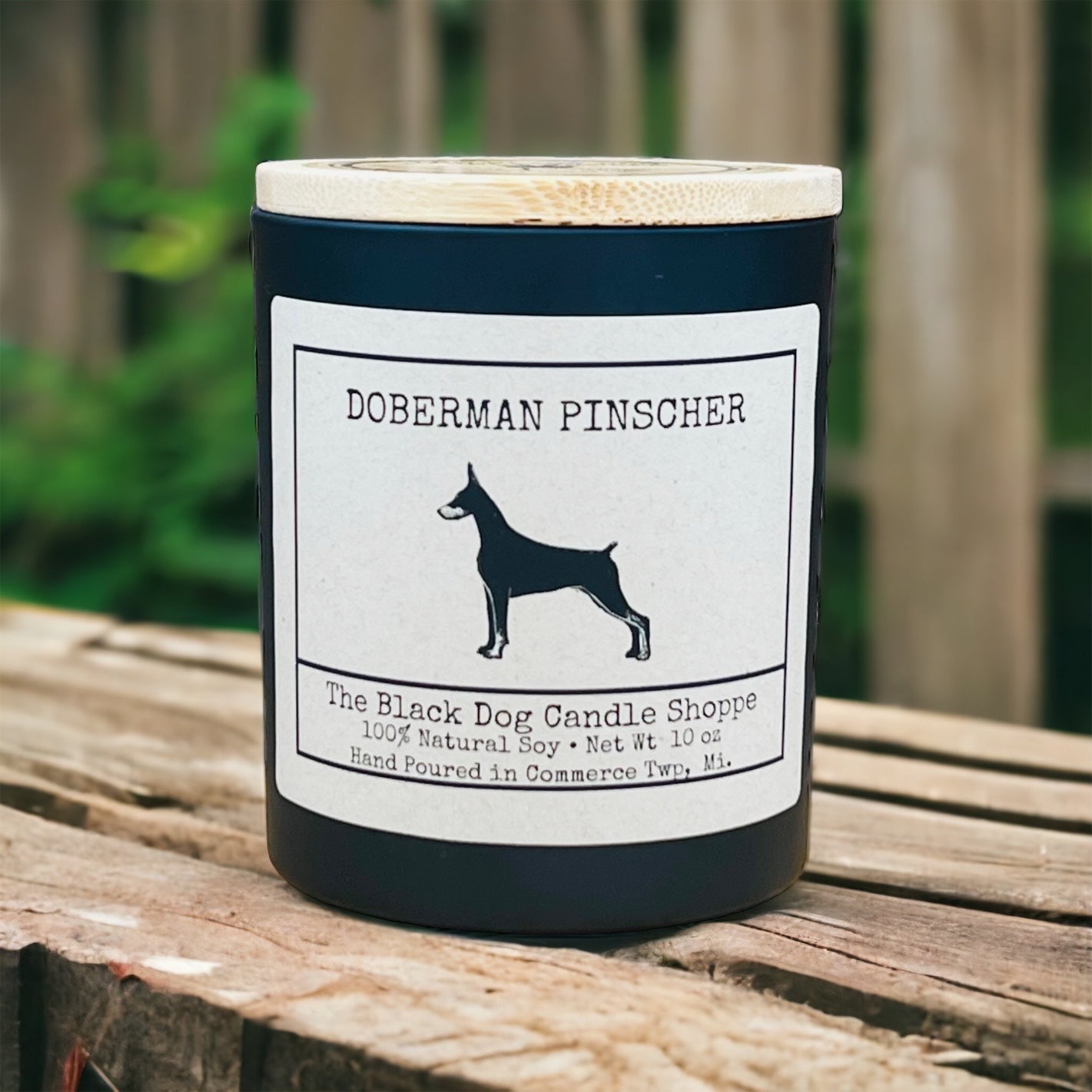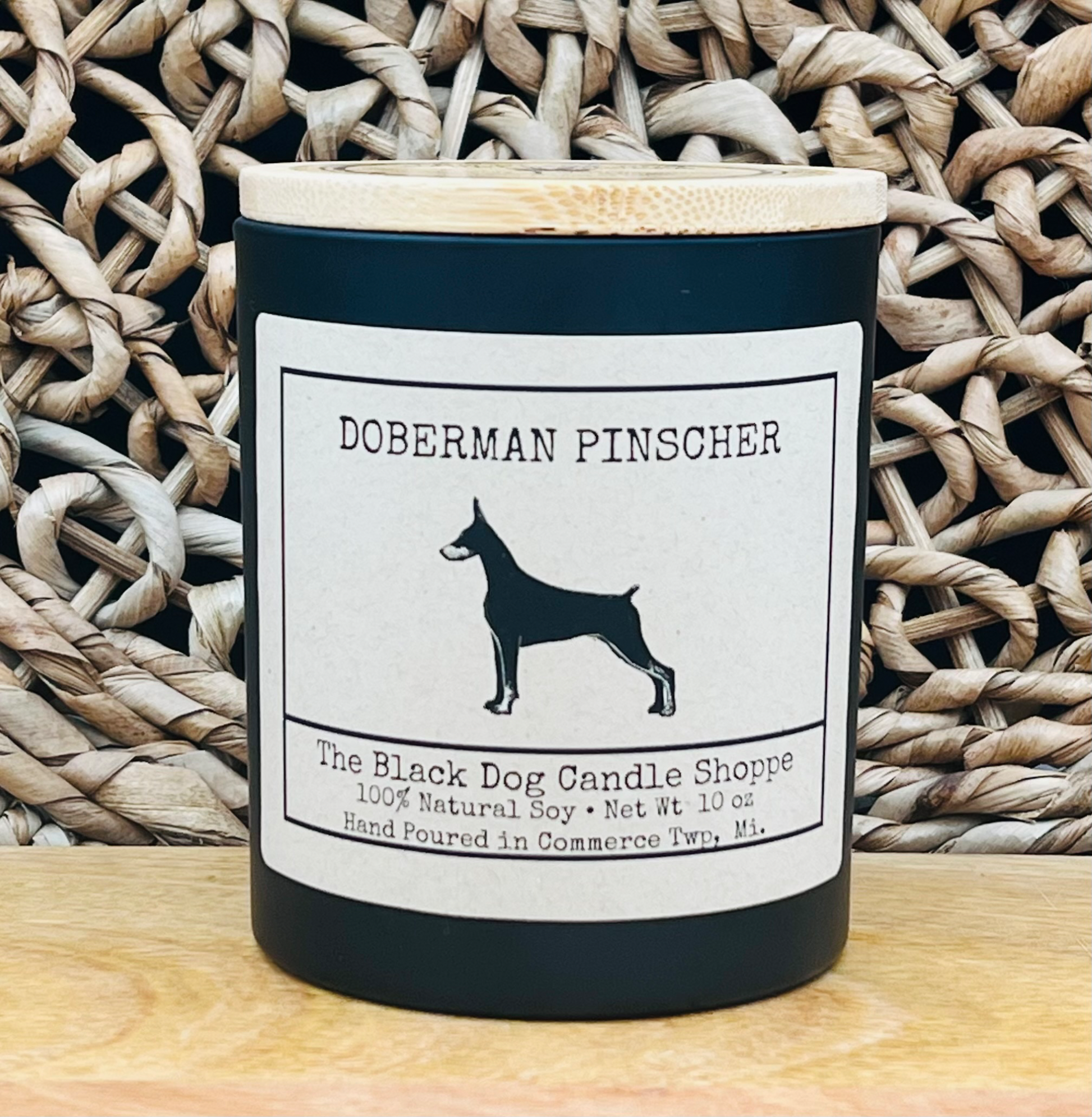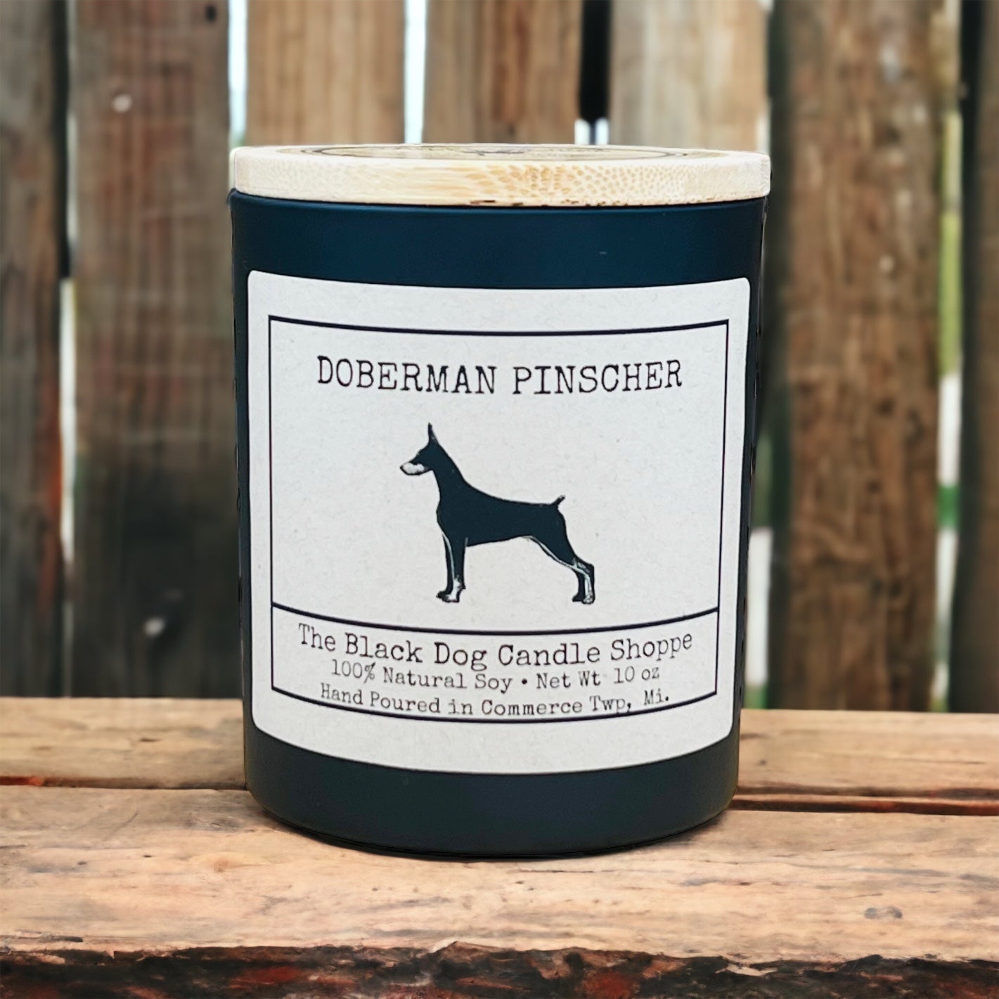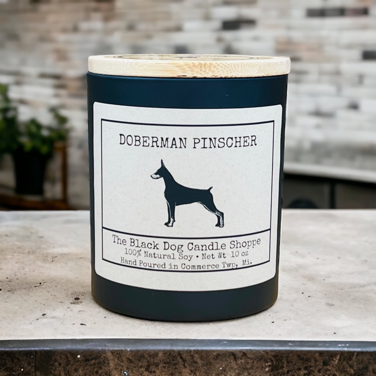 The Doberman candle features a sleek black vessel, exuding sophistication. Its Kraft label adds a touch of rustic charm, creating a harmonious blend of modern and natural aesthetics. The scent within promises a captivating experience, making it a stylish addition to any space.