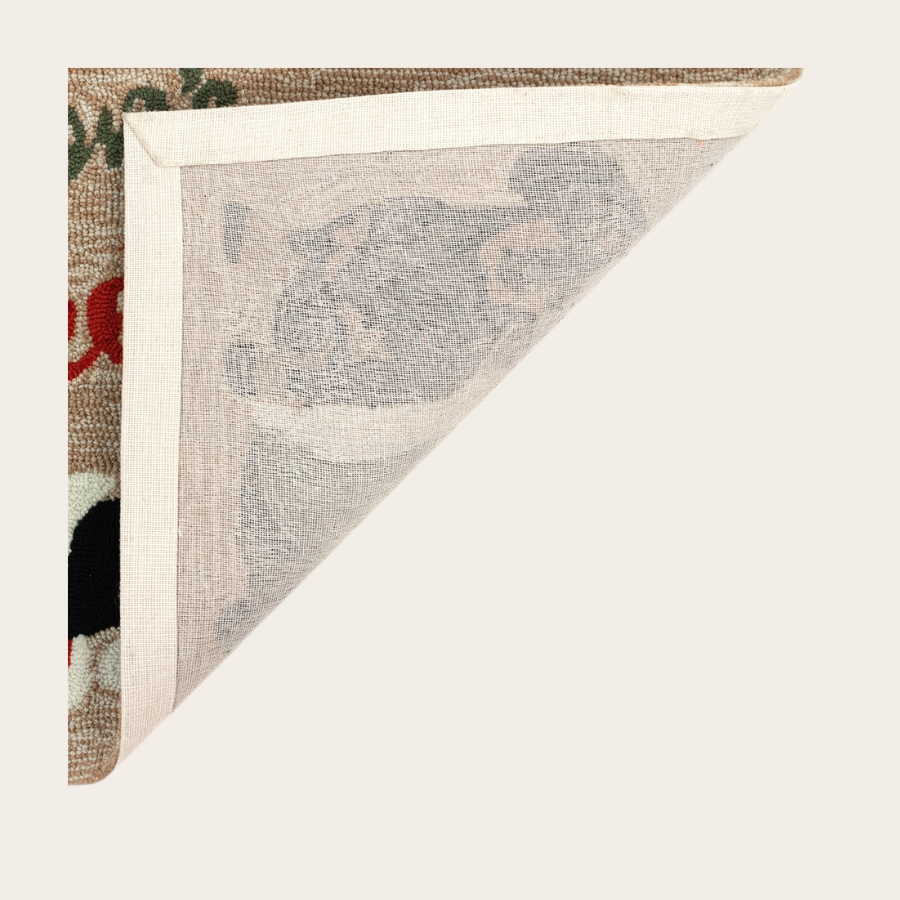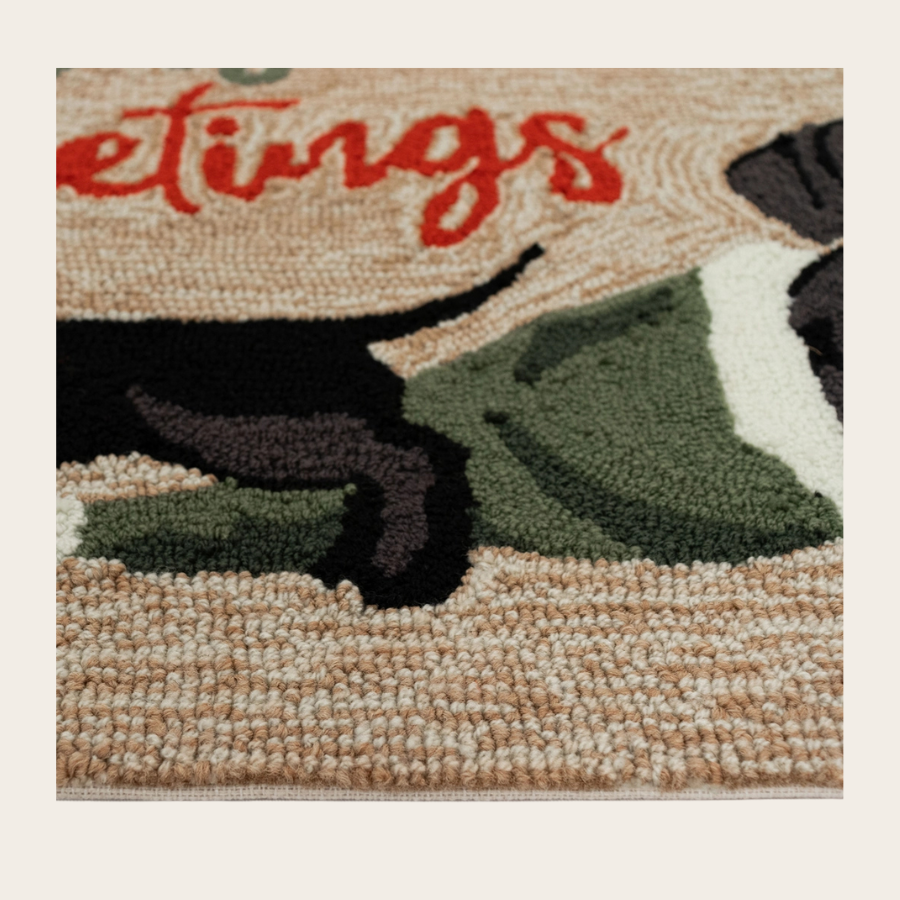Imagine finding two adorable puppies in Santa hats on Christmas morning. This mat features a holiday welcome with green and red accent colors on a tan background. This happy scene makes this mat the perfect accent to welcome guests at your door, at your kitchen sink, or in any space inside or outside your home. Made in China from a polyester/acrylic blend, the Frontporch Collection is hand tufted to create detailed designs with intricately blended colors for a high-quality finish. The material is hand hooked to create both softness and durability with weather resistant and added fade resistant treatment that is remarkably easy to clean. These pieces are perfect for you patio, entryway, bathroom, laundry room and kitchen making this the ideal rug. These vibrant, crisp and detailed patterns range from coastal, farmhouse, novelty sayings, pets and traditional designs to perfectly accent your home. Limited exposure to elements will prolong rug life.