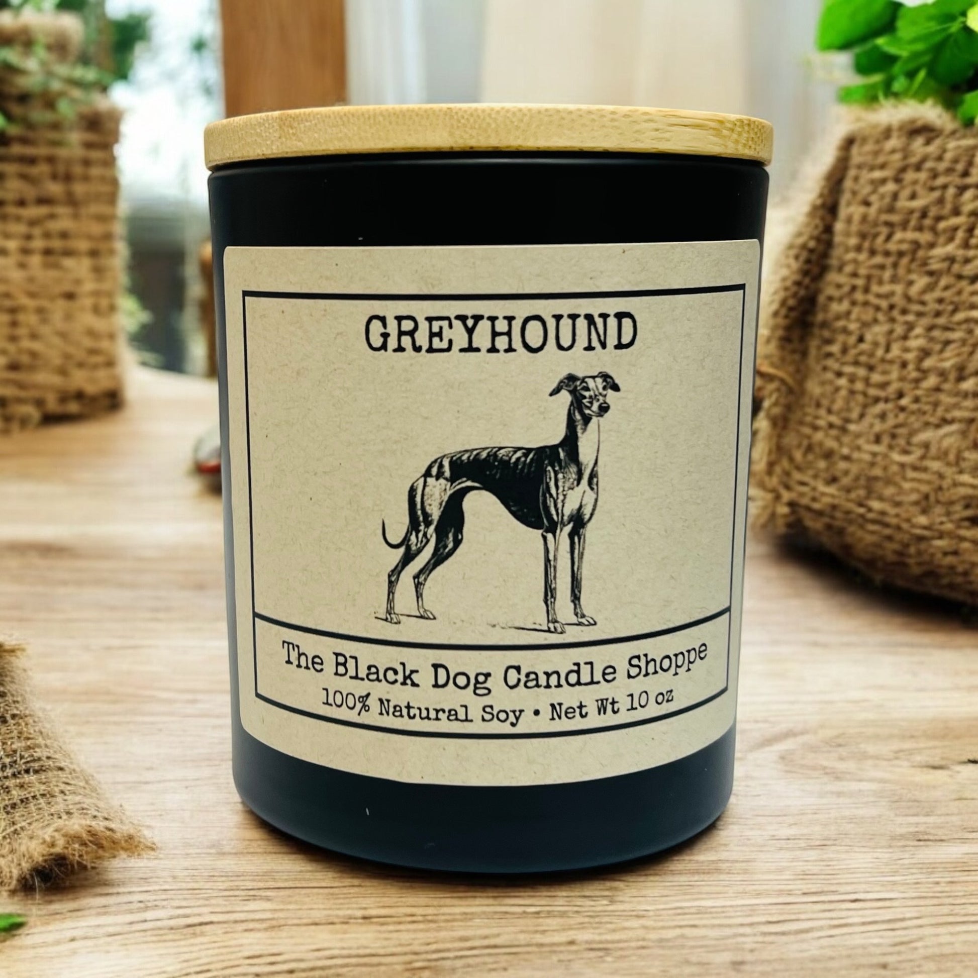 Greyhound themed candle. Black glass vessel with a kraft label. Graphic of greyhound has a vintage look.
