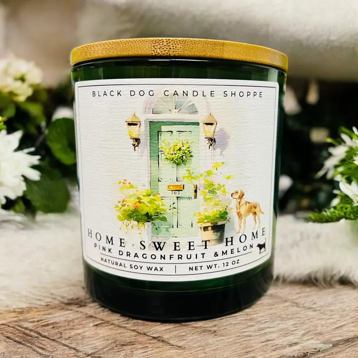 Large two wick candle in translucent green glass vessel. Made with 100% natural soy wax. Air-tight wooden sealed lid. Image of a dog waiting by front door with vibrant colors of flowers adorning the front porch, printed on a thick textures label.