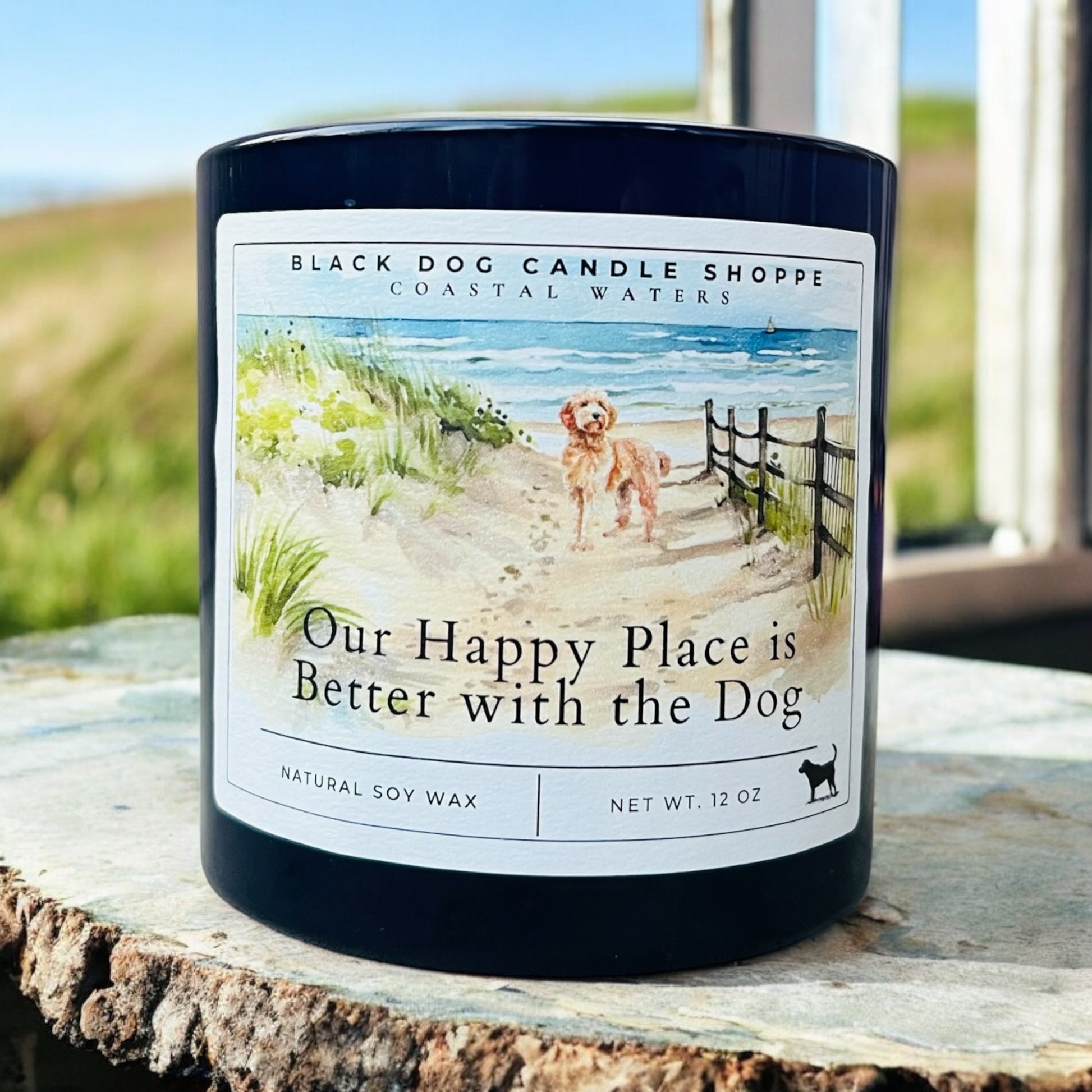 Pet-Inspired Message: "Our Happy Place is Better with the Dog" – perfect for dog lovers.